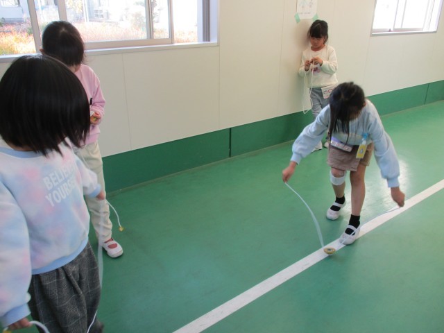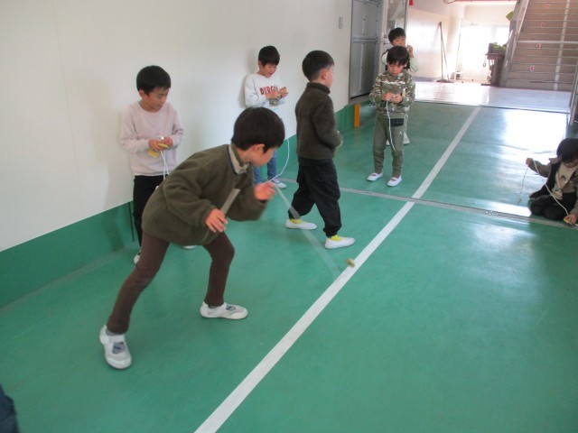 むかしあそびのこままわしに挑戦しています。まずひもをまくところから苦戦していました。上手に回せる子をお手本に何回も挑戦していました。