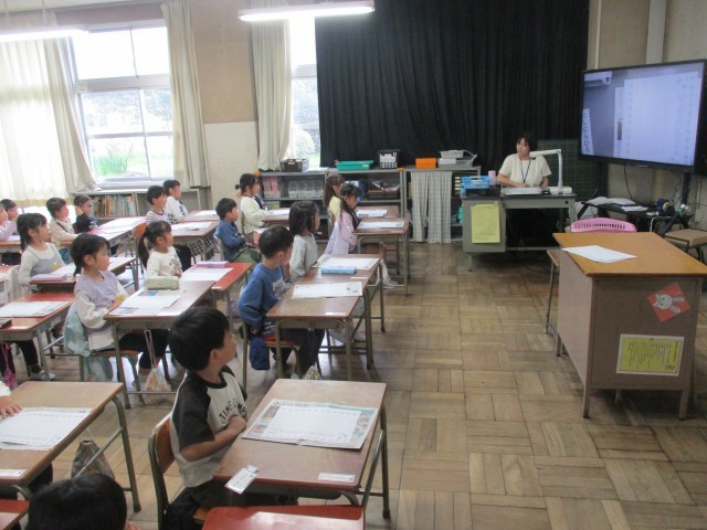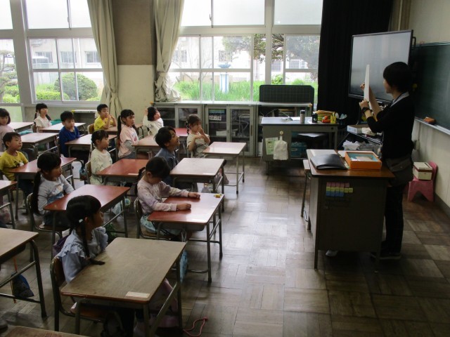 今日は1年2組が英語に挑戦!先生の話す英語を真似してがんばって話していました。いろいろなゲームをしながら英語に親しみました。
