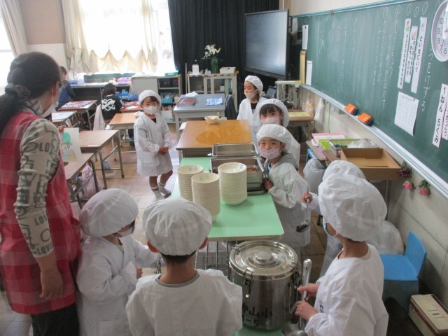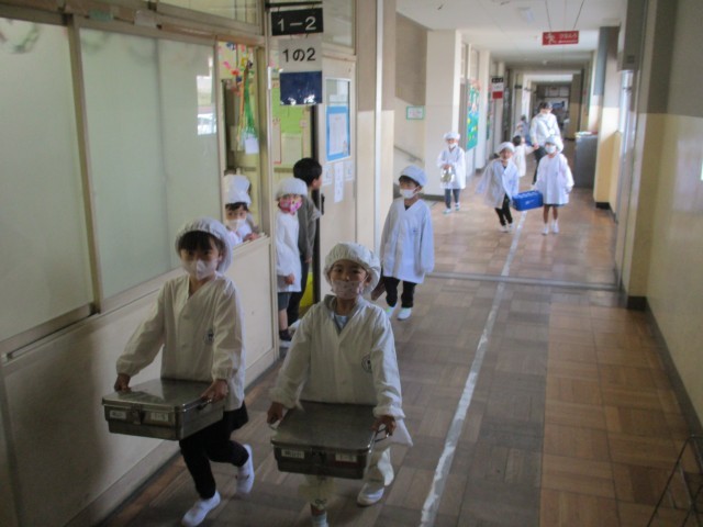 はじめての給食の様子です。どのクラスも「おいしい」という声がとびかっていました。協力して給食を配膳したり、自分で片付けをしたりどの子も一生懸命でした。