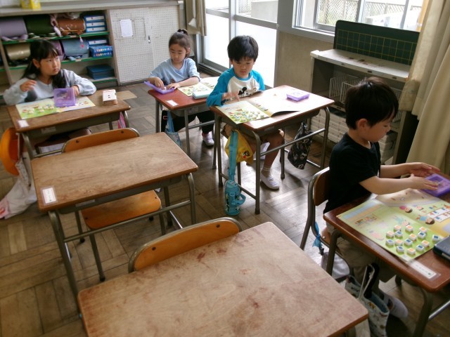 今日は1年2組が英語に挑戦!先生の話す英語を真似してがんばって話していました。いろいろなゲームをしながら英語に親しみました。