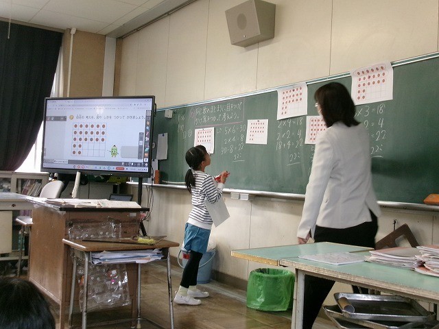 九九カードを使って、グループで問題を出し合いました。「答えが45になる九九は?」と聞かれ、覚えた九九を唱えながら答えていました。「正解!」「おしい!」「がんばって!」の声がたくさん聞こえてくる楽しい授業でした。