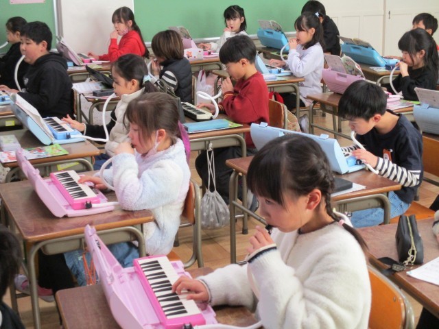 音楽で、「汽車は走る」を3パートにわかれて演奏しました。汽車が走る様子が伝わるようにがんばりました。他にも「ウンパッパ」の曲に合わせて、3拍子のリズムを手や膝打ちで表現しました。とても楽しい時間になりました。