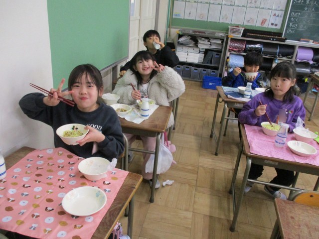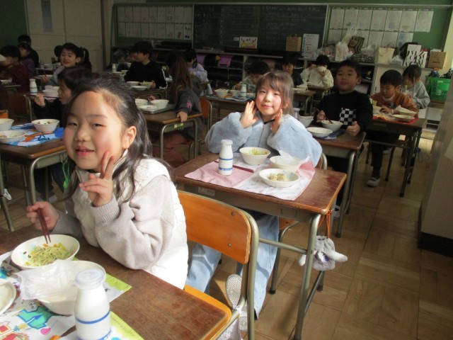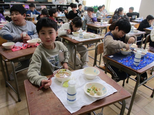 大好きな給食の時間です。しっかり食べて、風邪や病気に負けないぞ!