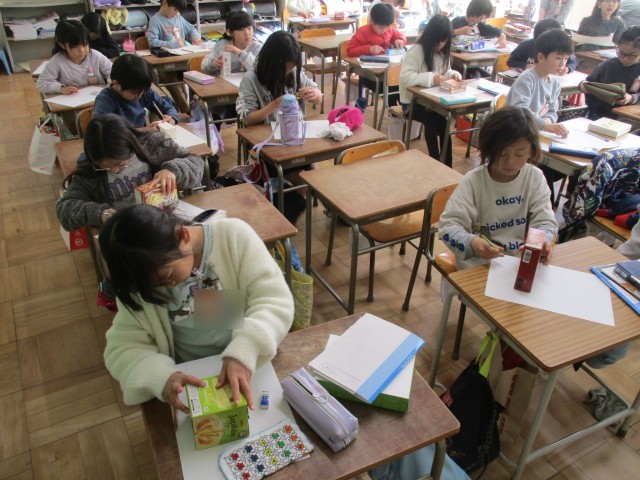算数では箱の面に紙をはるにはどうしたらよいか考えていました。