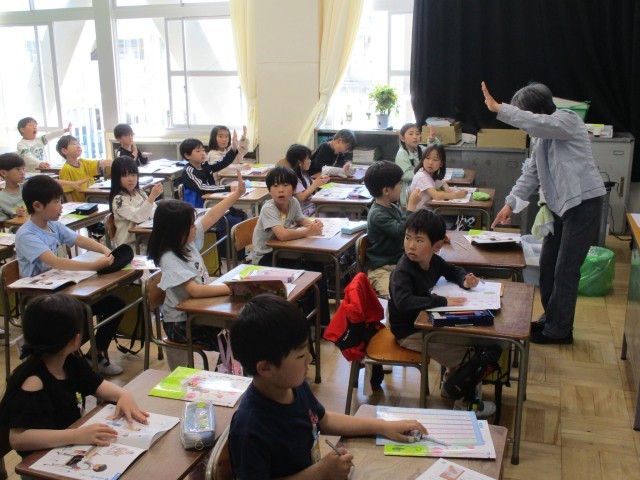 先生の問いかけに、たくさんの子が手を挙げて発表しようとしています。