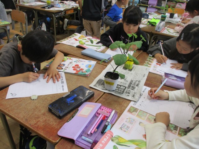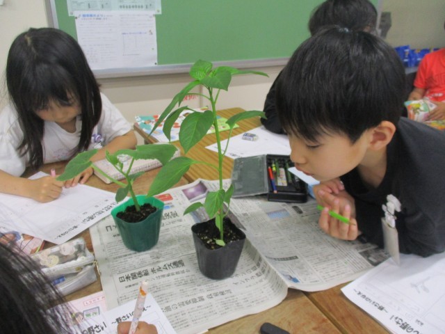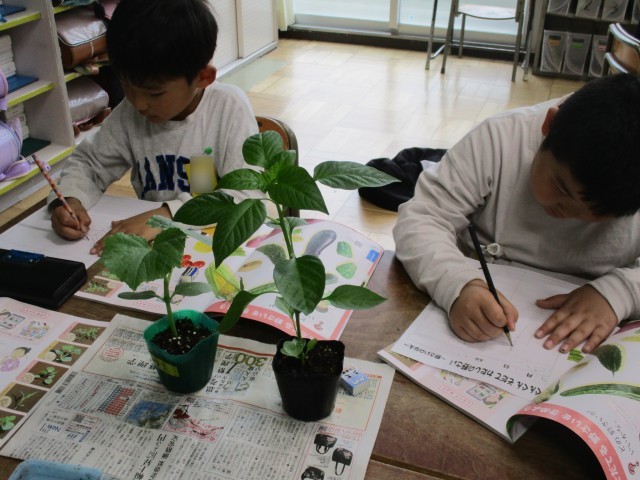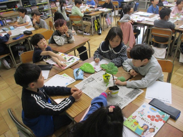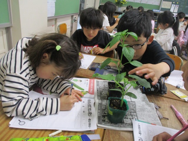 学年園で育てる野菜の苗を観察しました。「なす」「きゅうり」「ピーマン」「えだまめ」、それぞれの特徴をよく見て、においをかいで、手で触って観察をしました。「ざらざらしてる!」「こっちはつるつるだよ!」かわいいらしい声がたくさん聞こえてきました。