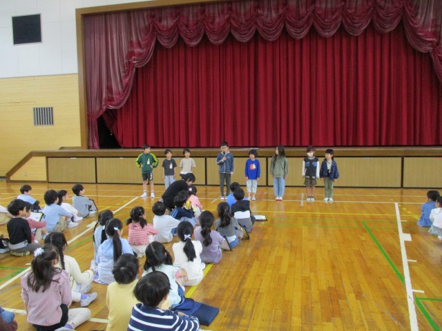 今日は、お別れ会をしました。1年間過ごした仲間と遊ぶ最後の時間でした。運動場では、おにごっこ、教室では班ごとの出し物で遊んで楽しい時間を過ごしました。