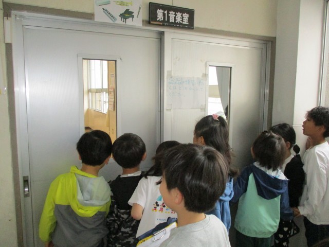 お兄さんお姉さんになった2年生。今日は、1年生に神山小学校のいろいろな場所を紹介しました。神山小学校は広いので、地図を見たり、1年生に話を聞いたりしながら音楽室や多目的ホールなど、いろいろな場所を紹介しました。