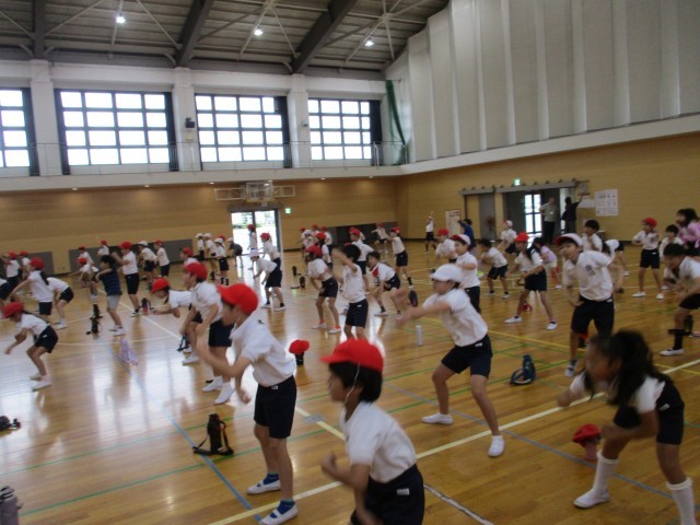 アリーナで、ソーラン節の振り付けの確認を3年生みんなで行いました。大きく動いたり、振り付けをそろえたり、声を出したりなど、ダイナミックな動きを目指してがんばりました。