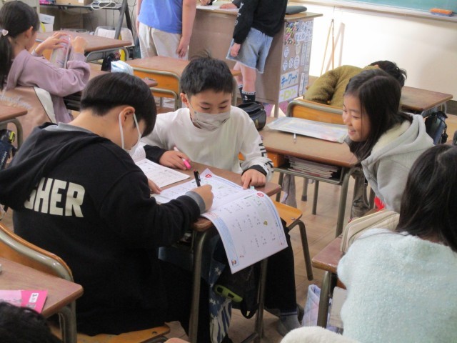 先生の話を聞いて問題を解いたり、グループで話し合ったりしていました。