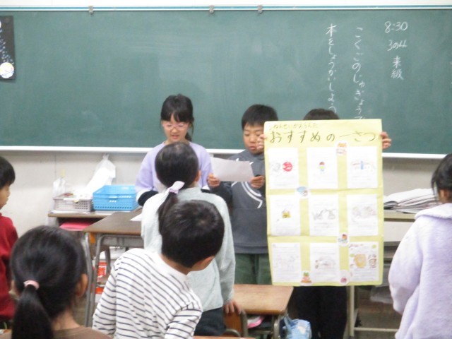本日は、以前の国語の学習で取り組んだ「おすすめの1さつを決めよう」で選んだ「一年生が楽しめる本」実際に1年生に紹介しました。本の面白さが伝わるよう、班ごとに決めた一さつを一生懸命に書いた紹介文や絵をまとめて、まとめたものを1年生に掲示したてもらいました。