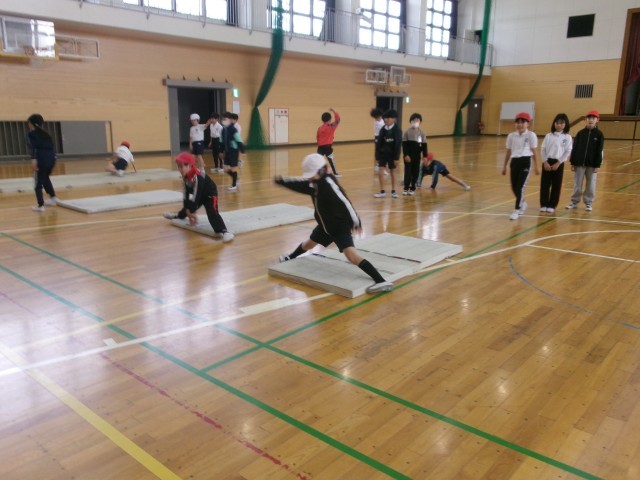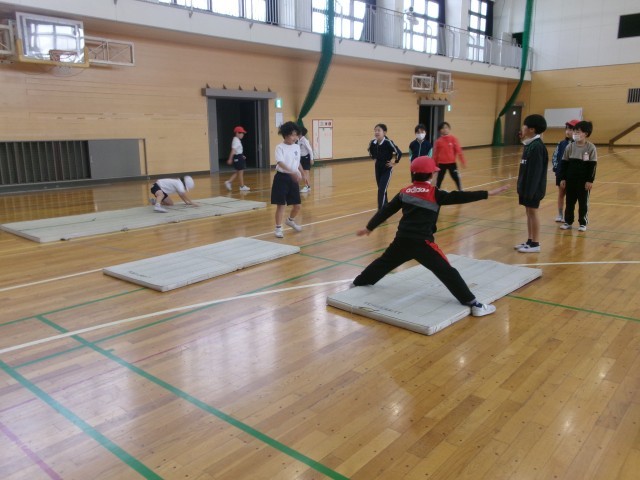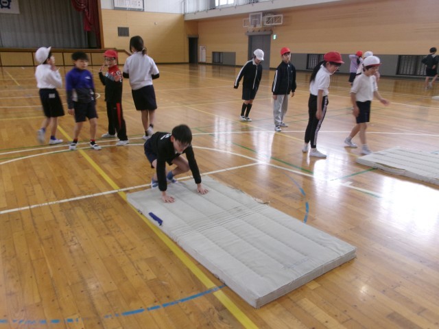 マットで、前転や後転、開脚前転や開脚後転などを練習しています。手の着き方や腰の位置など、上手に回転できるように、友達と教え合いながらマット運動を取り組みました。