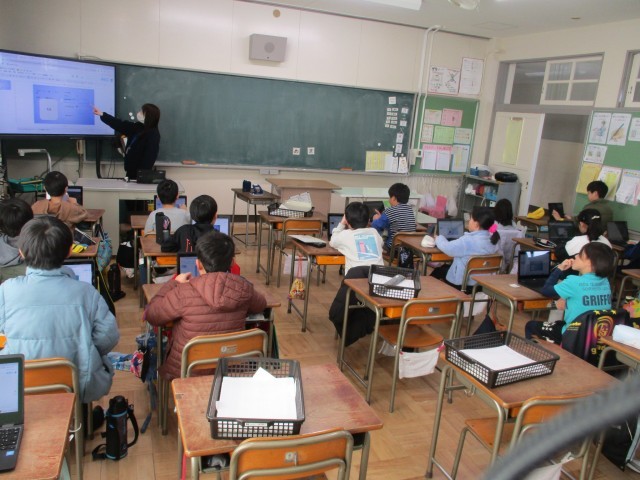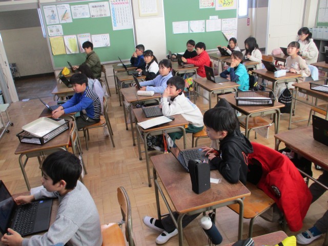 自分の考えを班で話し合い、パソコンを使って班の意見を全体で共有することができました。