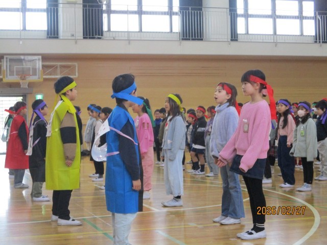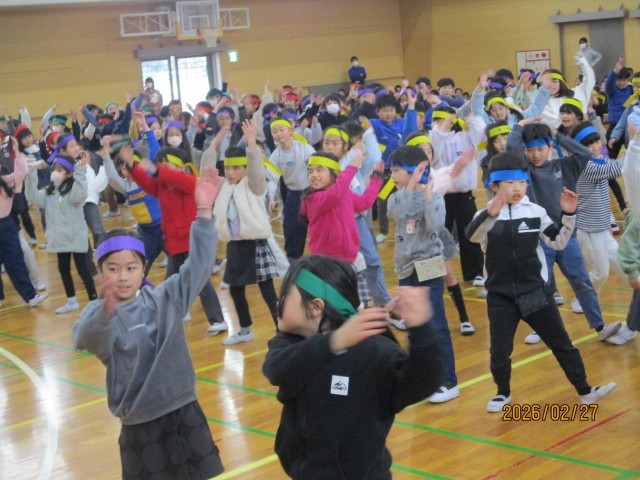 本日卒業生を送る会で、3年生は卒業生へのエールとダンスを送りました。中学校で頑張る6年生が多くのものを得られるよう、大漁祈願のソーラン節を力いっぱい踊りました。
