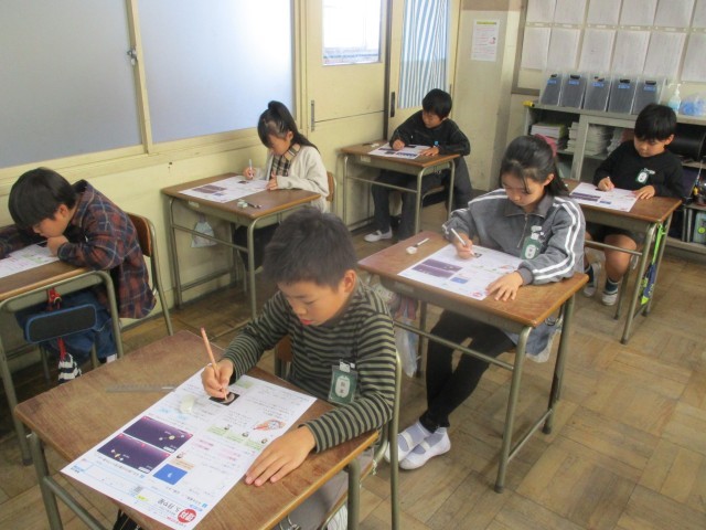 今日の書写では「土地」を書く練習をしています。「地」の字には書く時のポイントがたくさんあります。上手に書けるように何回も書いて練習していました。