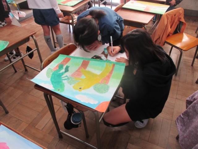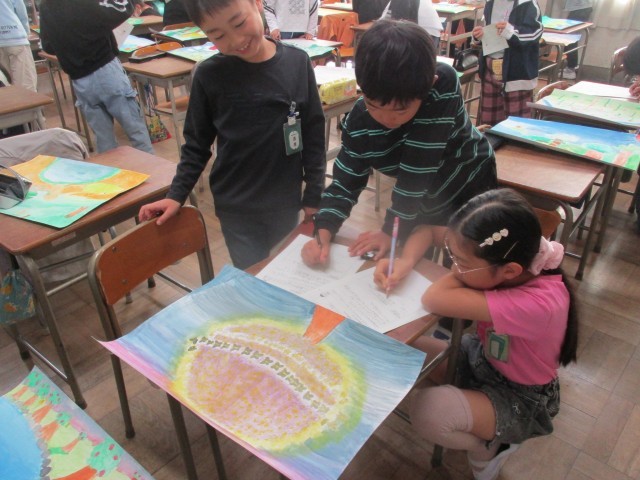 頑張って制作した読書感想画の鑑賞をしました。好きな場面をどのように表したかという視点で鑑賞しました。