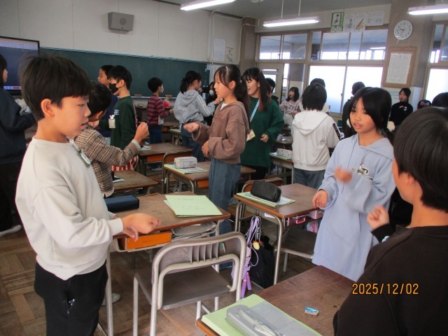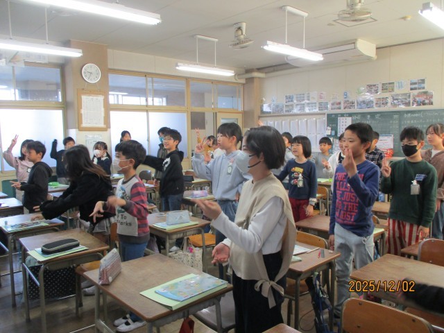 英語の授業では、歌に合わせて挨拶をしたり、ローマ字の練習をしたり、いろいろな学習をしています。