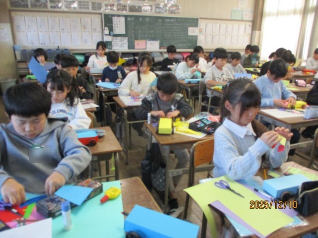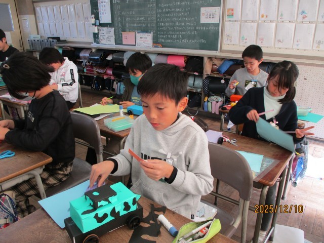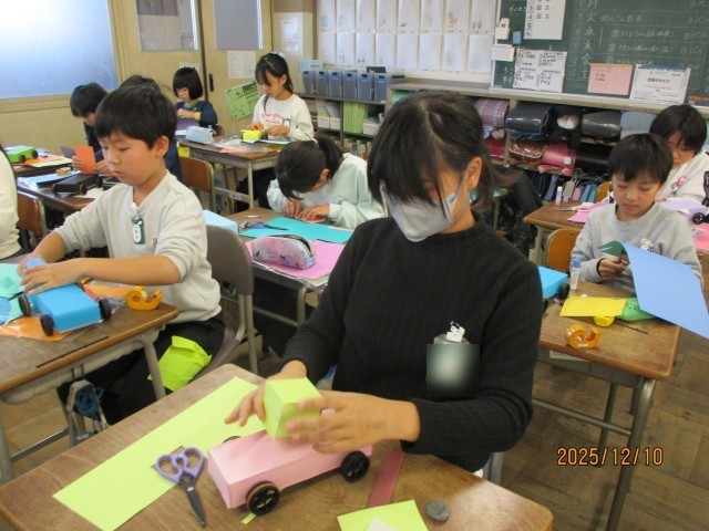 作品展の作品作りが始まりました。この時間は、車の本体を組み立てて色画用紙を貼りました。どの子も角と角がしっかり合うように気を配りながら、丁寧に貼り合わせることができました。その後は、どんな車を作ろうか、どんな飾りつけをしていこうかなど、楽しみながら設計図をかいていました。