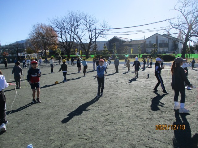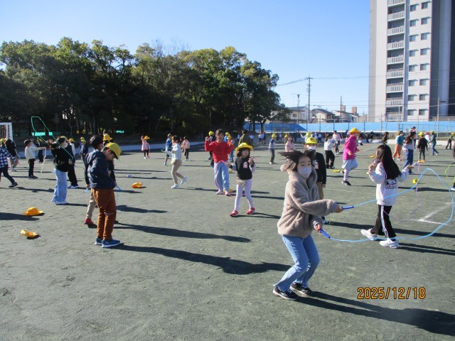 お互いに何回とべるか数えたり、とび方を教えあったりして、一緒になわとびを楽しみました。