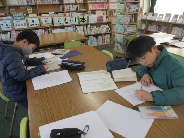 図工では木版画の学習に入りました。今日は、クロームブックで動物の写真を見ながら下絵をかきました。体の動きや毛の生え方など細かいところまでよく見てかいていました。この下絵をもとにして板を彫刻刀で彫り、刷っていきます。どんな作品になるのか今から楽しみです。