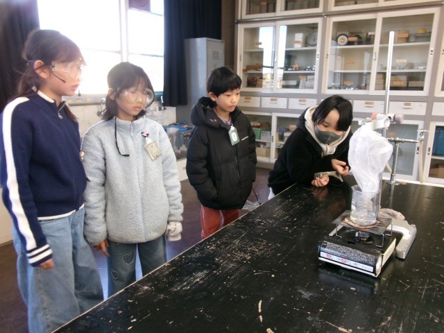 理科室で、水を熱すると時間とともにどのように変化していくのかを実験しました。安全に気をつけながら、丸底フラスコに入れた水の様子をじっくり観察していました。