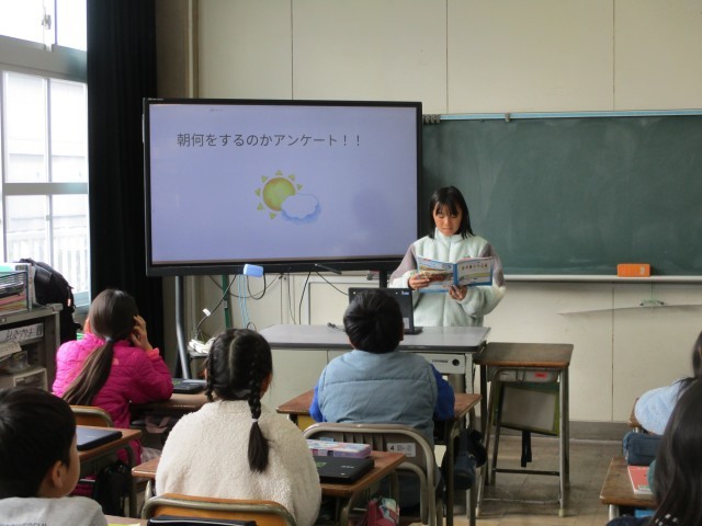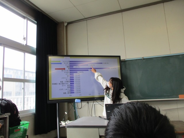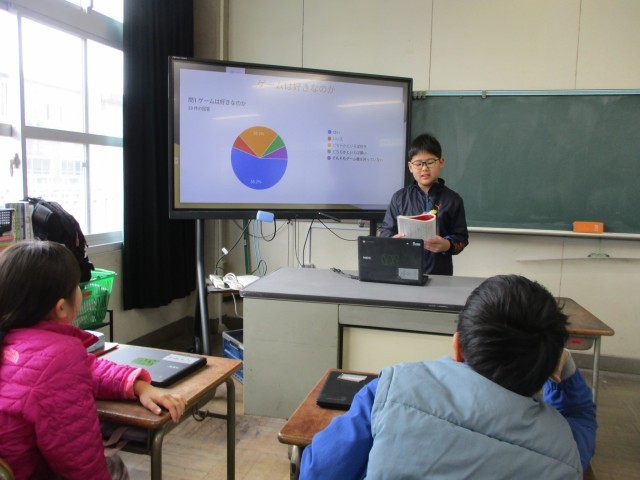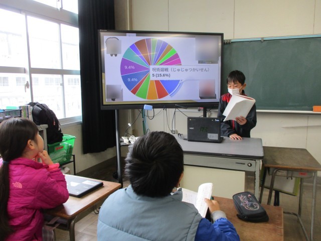 国語の授業で、クラスのみんなの生活についてアンケートを取り、その結果をパソコンでまとめました。声の強弱を意識したり、資料を指し示したりするなど、聞いている人に伝わりやすいように工夫して発表していました。