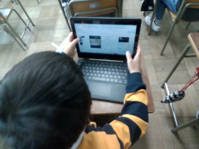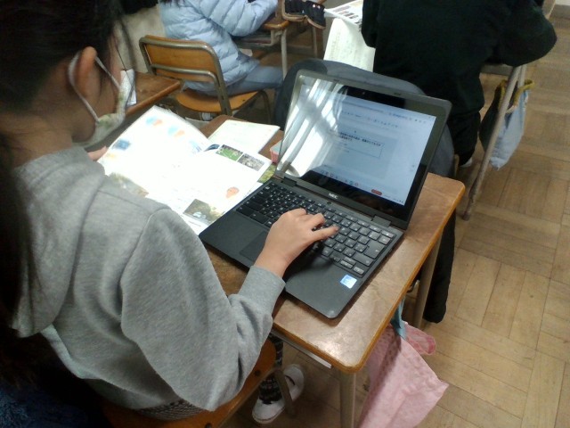 生活の中での気になることについて調べ、その結果と自分の考えを発表します。結果が伝わりやすいように、資料を作成している様子です。