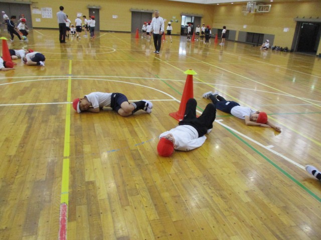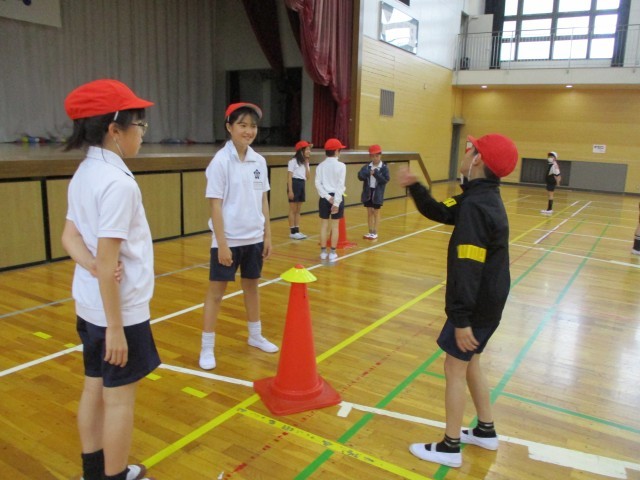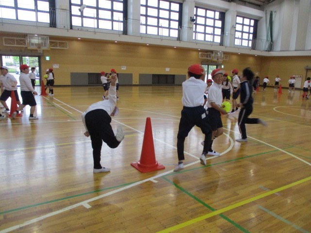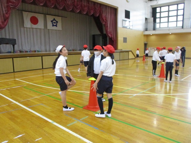 今日は、アリーナで初めての体育の授業がありました。体力テストの練習として、反復横跳びにチャレンジしたり、体をつかったマーカーキャッチ遊びをしたりしました。