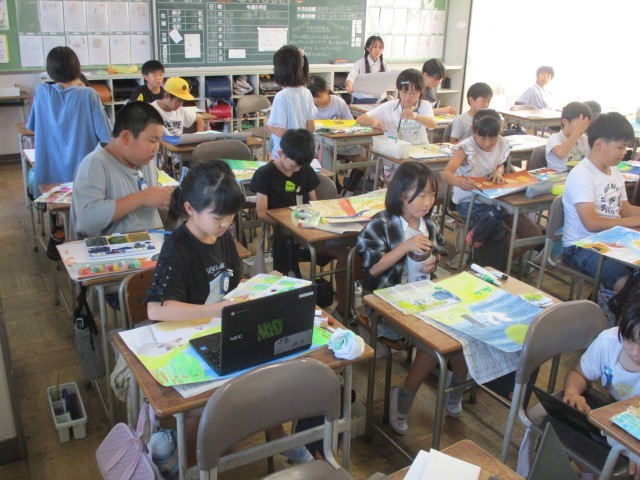 今日の図工では、物語を聞いて膨らましたイメージを、思い思いの色づかいや構図で表現していました。