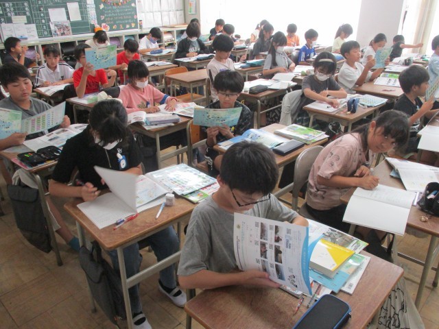 5年生の学習室をのぞいてみると、家庭科の先生と子供たちが何やら作業をしていました。話を聞いてみると、ボランティアで掲示物を制作しているとのことでした。このほかにも、授業で使うものを運んでくれる子や、係の仕事を手伝ってくれる子など、やさしさとボランティア精神に満ちた様子が見られました。