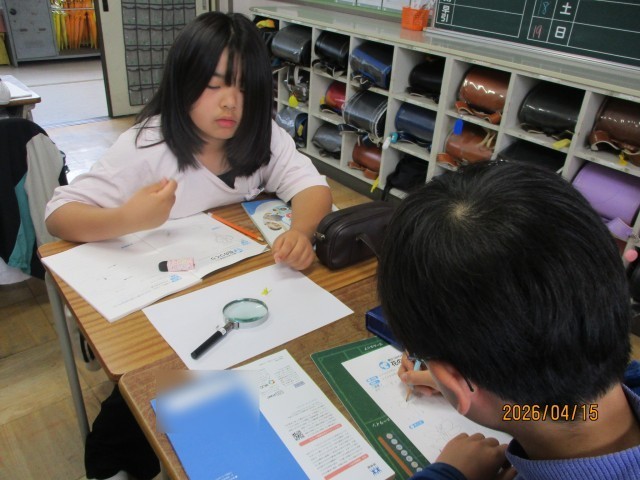 教室へ戻り、虫眼鏡を使ってじっくり観察しました。