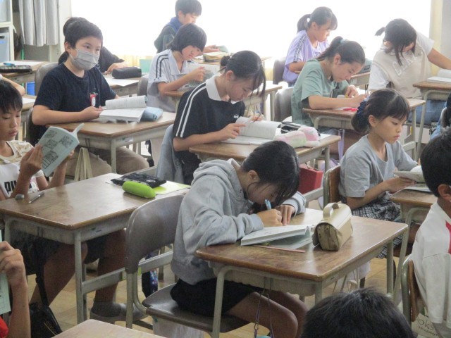 朝学習の時間です。漢字を覚えたり、プリントで繰り返し練習をしたり、落ち着いて取り組んでいました。明日のなかよしフェスティバルの準備をしているクラスもありました。