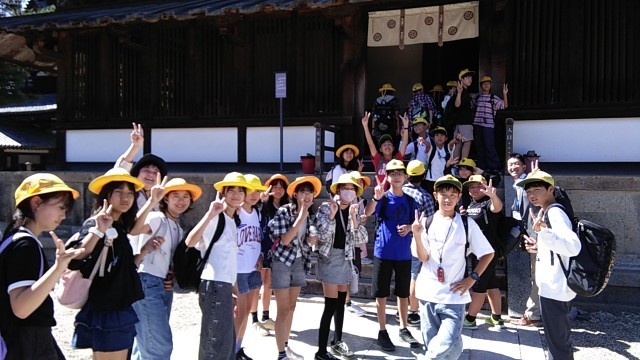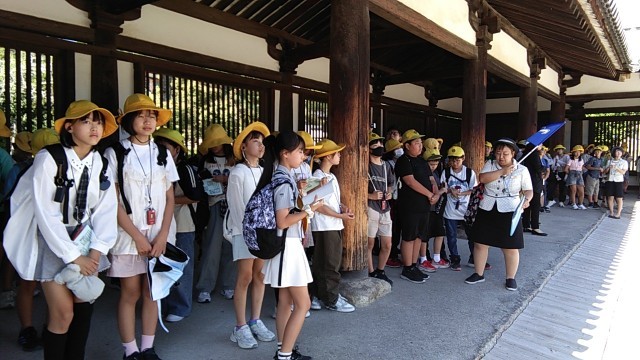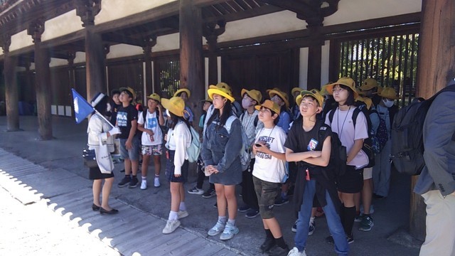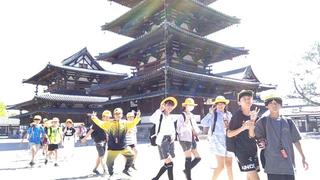 法隆寺でも、ガイドさんの授業をしっかり聞いていました。入り口の石を1度踏むといいと聞き、一人ずつちゃんと踏んで中に入っていました。