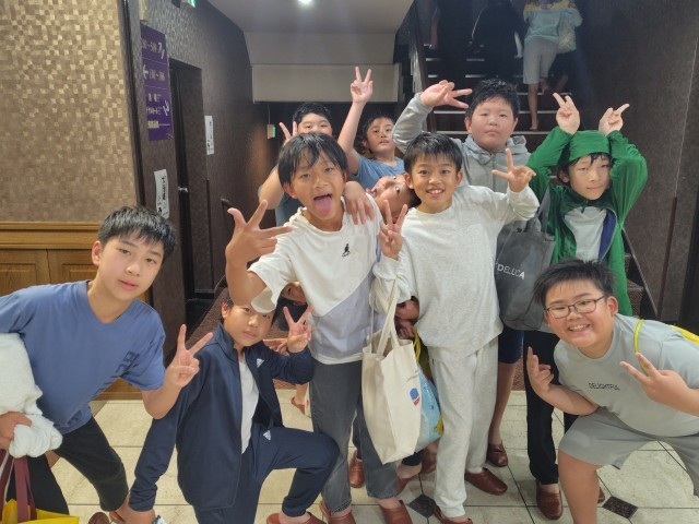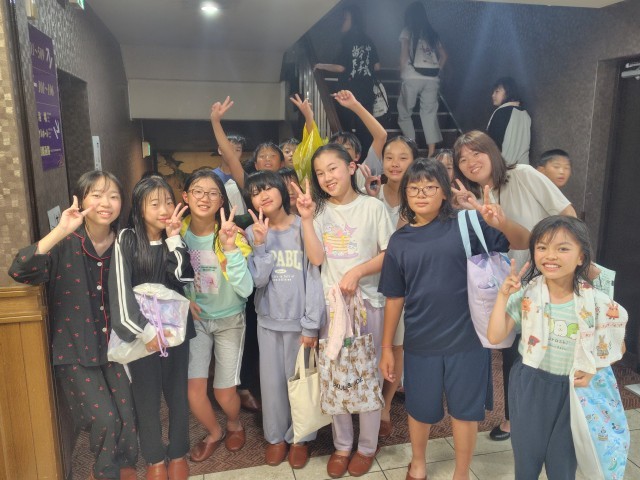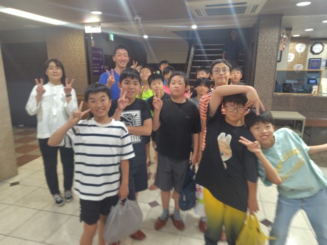 予定より少し遅れましたが、「いしちょう」に着きました。大きなホテルです。日も暮れて入り口の明かりにほっとします。みんな元気です!