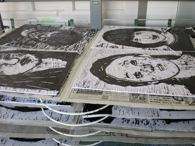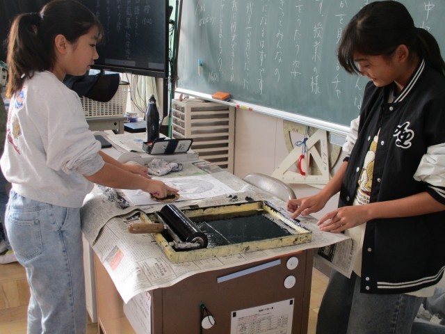 彫刻刀で彫った版を印刷しました。うまく刷れない部分は、もう一度彫りなおします。納得できるまでがんばる姿が見られました!力作ばかりです。