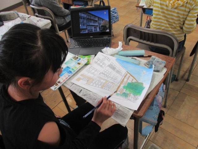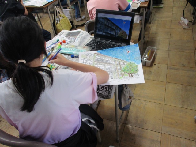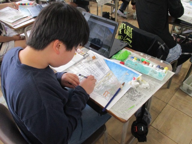 水彩絵の具を使って風景画を着色しました。水の量を調整して、にじませたりぼかしたりしながら色を塗っていました。また、色の塗る方向にも気をつけて、丁寧に塗る姿が見られました。6年間の集大成として、今までの学びを生かして作品作りをしていきたいですね。
