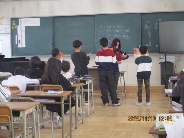 この写真は、「赤とんぼ」の歌のテストをしている様子をうつしたものです。みんな大きな声で強弱をつけながら歌っています。たくさん練習して、これからも頑張ってください。
