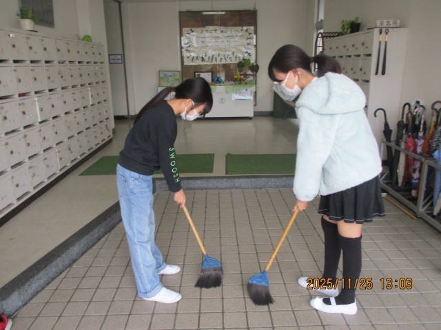 6年生がコンテナ室のそうじをしています。すみずみまでしっかりとほうきではいて、ていねいにぞうきんをかけています。きれいになると気持ちがいいですね。