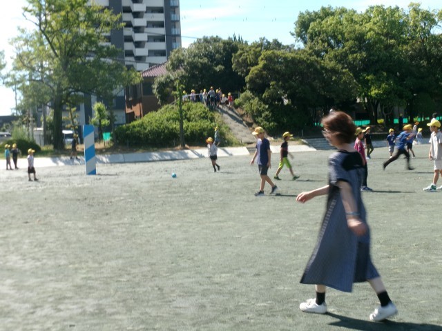 1年生から4年生までは校外学習のため、思い切り運動場で遊ぶことができます。先生も子どもたちと競争したり、ドッジボールをしたりしていました。鉄棒練習を見守っている先生方もいました。※3枚目写真の「+」をクリックするとそれ以外の笑顔が見られます。