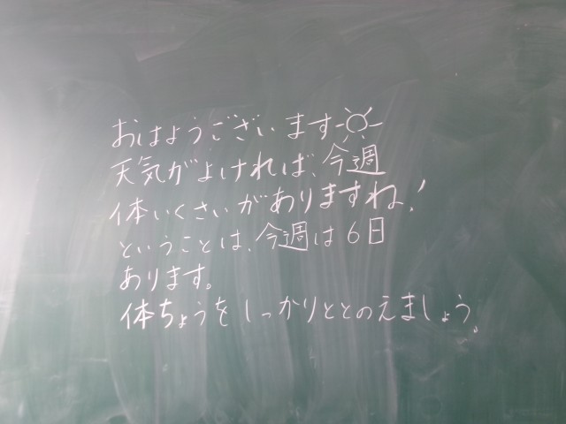 今朝の黒板のメッセージの一部です。午後から来年度小学校に入学する子を対象にした「新就学時健診」についての記載がありました。2学期は「なかまと協力すること」が必要な行事が多くあります。お互いの考えを伝えあうことで、学級の絆が強くなります。※3枚目写真の「+」をクリックすると、それ以外のコメントも見ることができます。