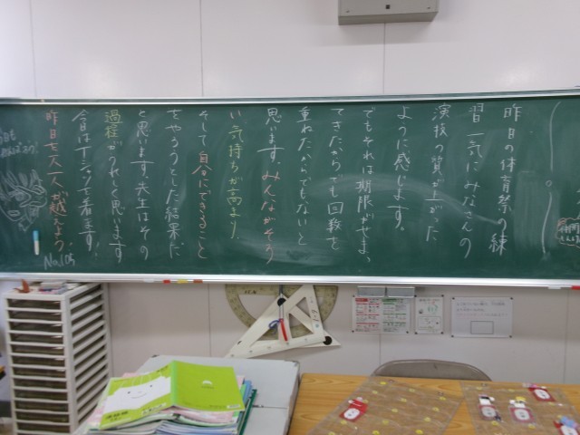 今朝の黒板のメッセージの一部です。「体育祭に向けての励まし!」の記載が多くありました。また、急に寒くなり体調を崩す子も少し増えています。2学期は「なかまと協力すること」が必要な行事が多くあります。お互いの考えを伝えあうことで、学級の絆が強くなります。※3枚目写真の「+」をクリックすると、それ以外のコメントも見ることができます。