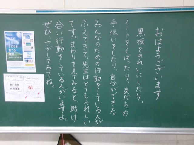 今朝の黒板のメッセージの一部です。「体育祭に向けての励まし!」の記載が多くありました。明日の朝には雨もあがる予報ですので、予定通り体育祭を実施できると思います。「なかまと協力すること」を学んだと思いますので、しっかり成果を発揮してください。※3枚目写真の「+」をクリックすると、それ以外のコメントも見ることができます。