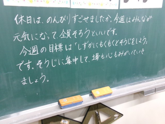 今朝の黒板のメッセージの一部です。「体育祭に向けての励まし!」の記載が多くありました。心配された運動場の状態も完璧です。「なかまと協力すること」を学んだと思いますので、しっかり成果を発揮してください。また、おやじの会・保護者ボランティアの皆様、今日はよろしくお願いします。※3枚目写真の「+」をクリックすると、それ以外のコメントも見ることができます。
