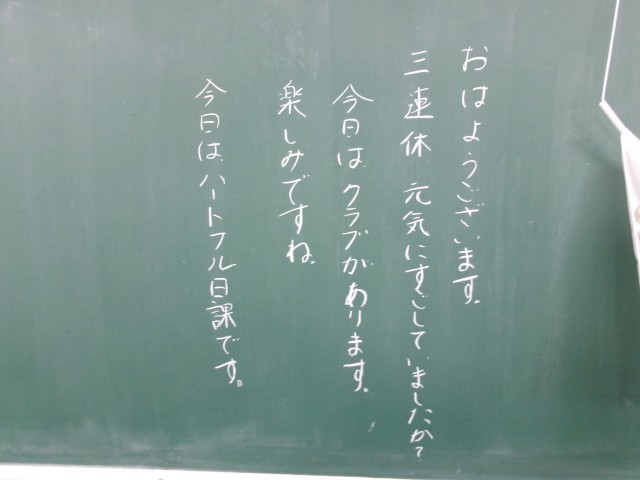 今朝の黒板のメッセージの一部です。「実りの秋!」という記載が多くありました。体育祭では「なかまと協力すること」を学んだと思いますので、これからの学校生活に生かしてください。市内ではインフルエンザによる休校が増えてきましたので、しっかり栄養・睡眠など予防をお願いします。※3枚目写真の「+」をクリックすると、それ以外のコメントも見ることができます。