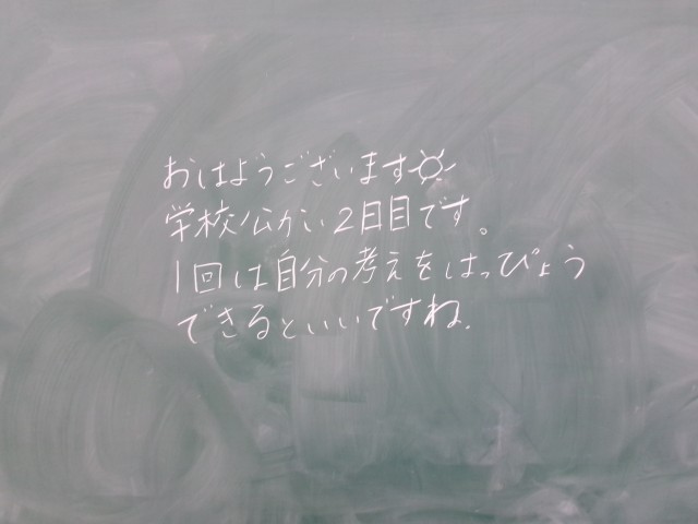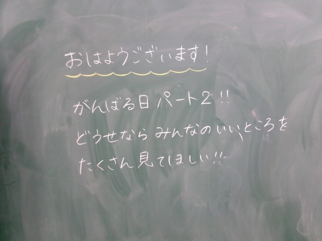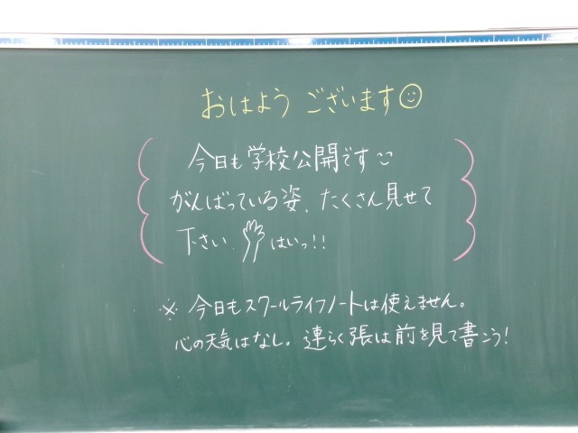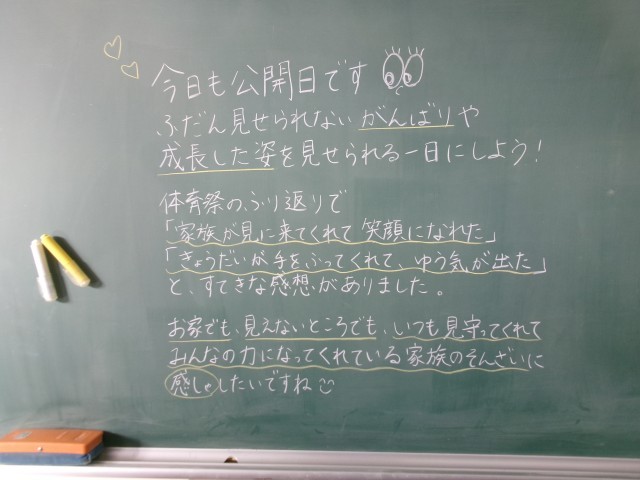 今朝の黒板のメッセージの一部です。「頑張る姿を見せてください!」という記載がありました。2日目の学校公開授業(2限・大放課・3限)が計画されています。子どもたちは保護者の皆様に「自分が頑張っていること」を見てほしいと思っています。多くの保護者の皆様の来校をお待ちしています。※3枚目写真の「+」をクリックすると、それ以外のコメントも見ることができます。
