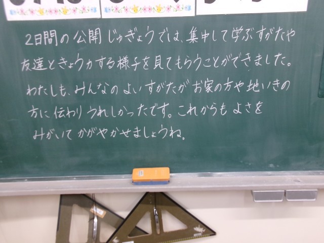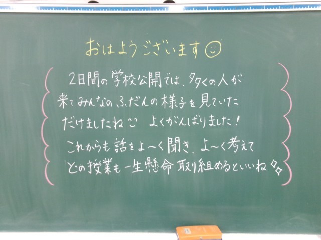 今朝の黒板のメッセージの一部です。「公開授業 よく頑張りました!」という記載がありました。2日目の学校公開では、多くの保護者の方に来校こうしていただきありがとうございました。子どもたちは保護者の皆様に「自分が頑張っていること」を見てもらうことができ、とてもうれしかったようです。※3枚目写真の「+」をクリックすると、それ以外のコメントも見ることができます。