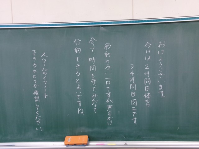 今朝の黒板のメッセージの一部です。「体育祭に向けての励まし!」の記載が多くありました。明日の朝には雨もあがる予報ですので、予定通り体育祭を実施できると思います。「なかまと協力すること」を学んだと思いますので、しっかり成果を発揮してください。※3枚目写真の「+」をクリックすると、それ以外のコメントも見ることができます。