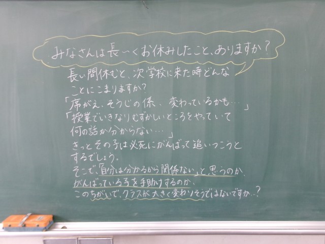 今朝の黒板のメッセージの一部です。「おもてなしの心!」という記載がありました。11日(2限・3限)と12日(2限・3限)には学校公開授業が計画されています。子どもたちは保護者の皆様に「自分が頑張っていること」を見てほしいと思っています。多くの保護者の皆様の来校をお待ちしています。※3枚目写真の「+」をクリックすると、それ以外のコメントも見ることができます。