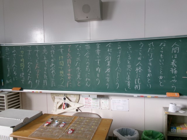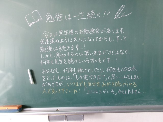 今朝の黒板のメッセージの一部です。「勉強は一生 続く!」という記載がありました。学校の中で一番多い時間は授業です。先生方は子どもたちのやる気を高めるためにいろいろな工夫をして授業を行っています。学校公開でも、保護者の皆様に「子どもたちが頑張っている様子」を見てもらうことができました。※3枚目写真の「+」をクリックすると、それ以外のコメントも見ることができます。