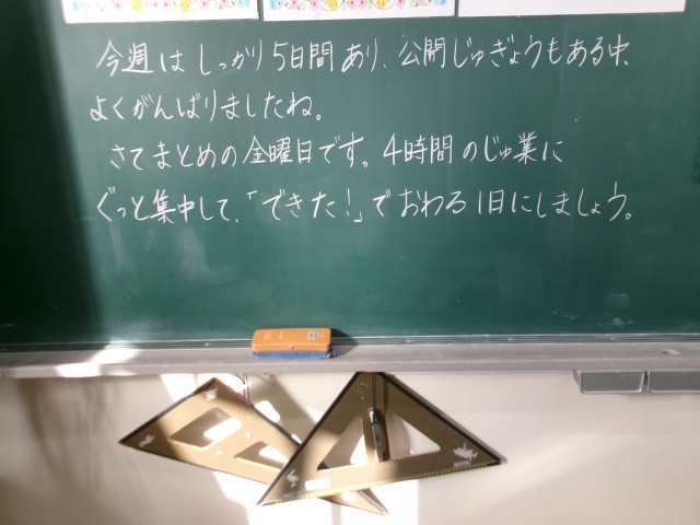 今朝の黒板のメッセージの一部です。「頑張る姿を見せてください!」という記載がありました。2日目の学校公開授業(2限・大放課・3限)が計画されています。子どもたちは保護者の皆様に「自分が頑張っていること」を見てほしいと思っています。多くの保護者の皆様の来校をお待ちしています。※3枚目写真の「+」をクリックすると、それ以外のコメントも見ることができます。